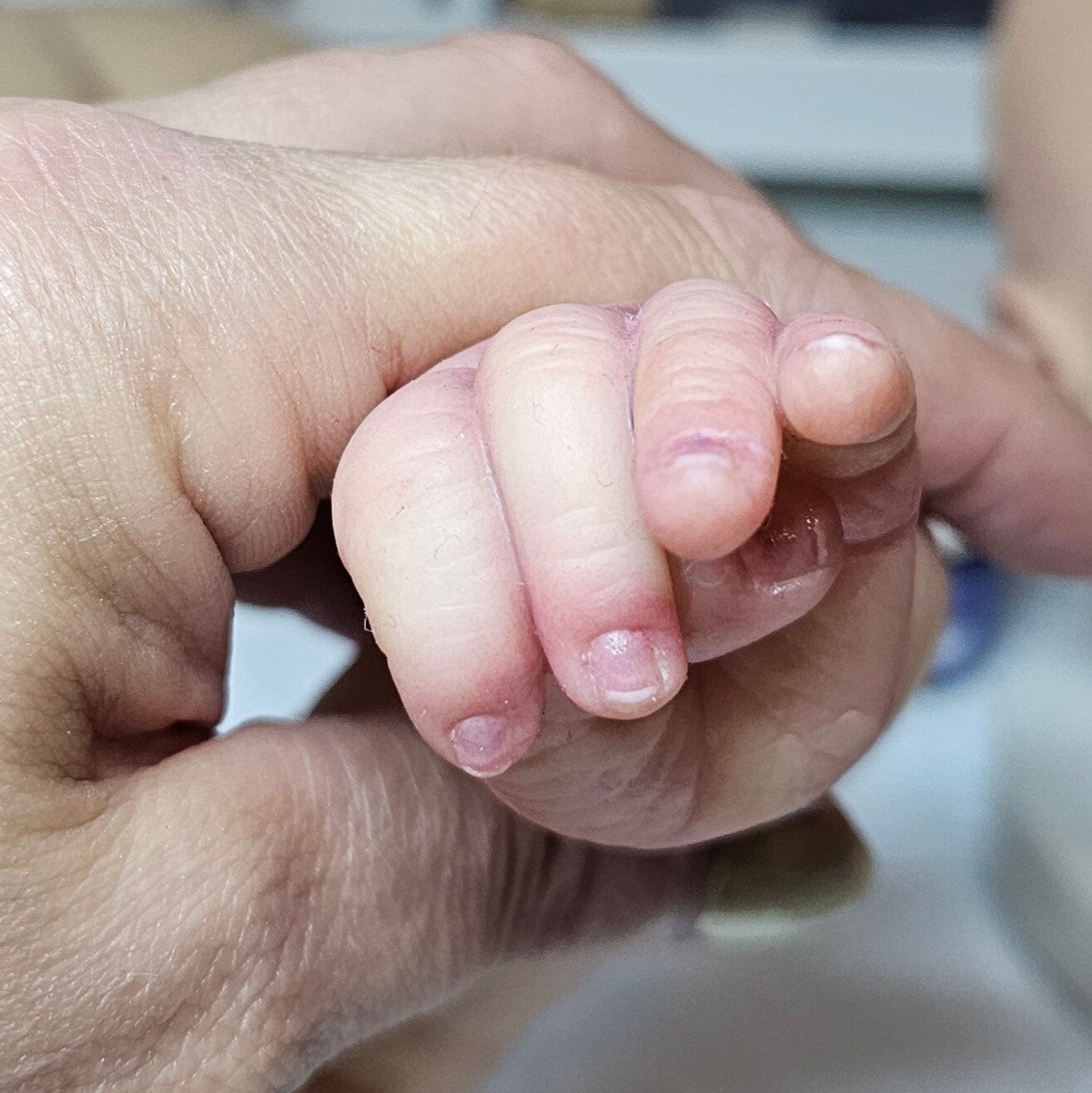 Met die kleur heb ik over het midden van elk nageltje in een halve cirkel een rood tintje aangebracht, zodat er bovenaan een wit half maantje zichtbaar blijft. Dat geeft meteen die typische, natuurlijke uitstraling van echte baby-nageltjes.